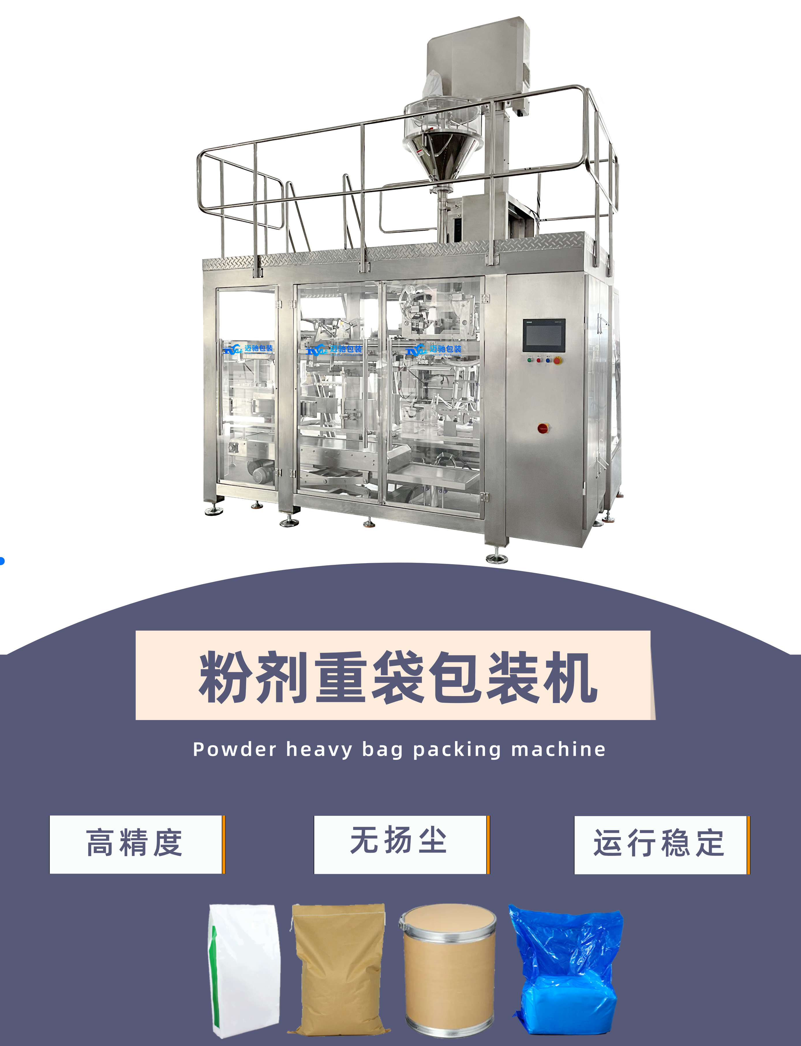迈驰是一家专业生产全自动粉剂包装机厂家,可根据客户不同物料特性定制一对一方案,可包装粉末、粉剂、粉体等物料,为您解决粉尘扬尘、包装精度的问题。一键调节袋宽,换产...